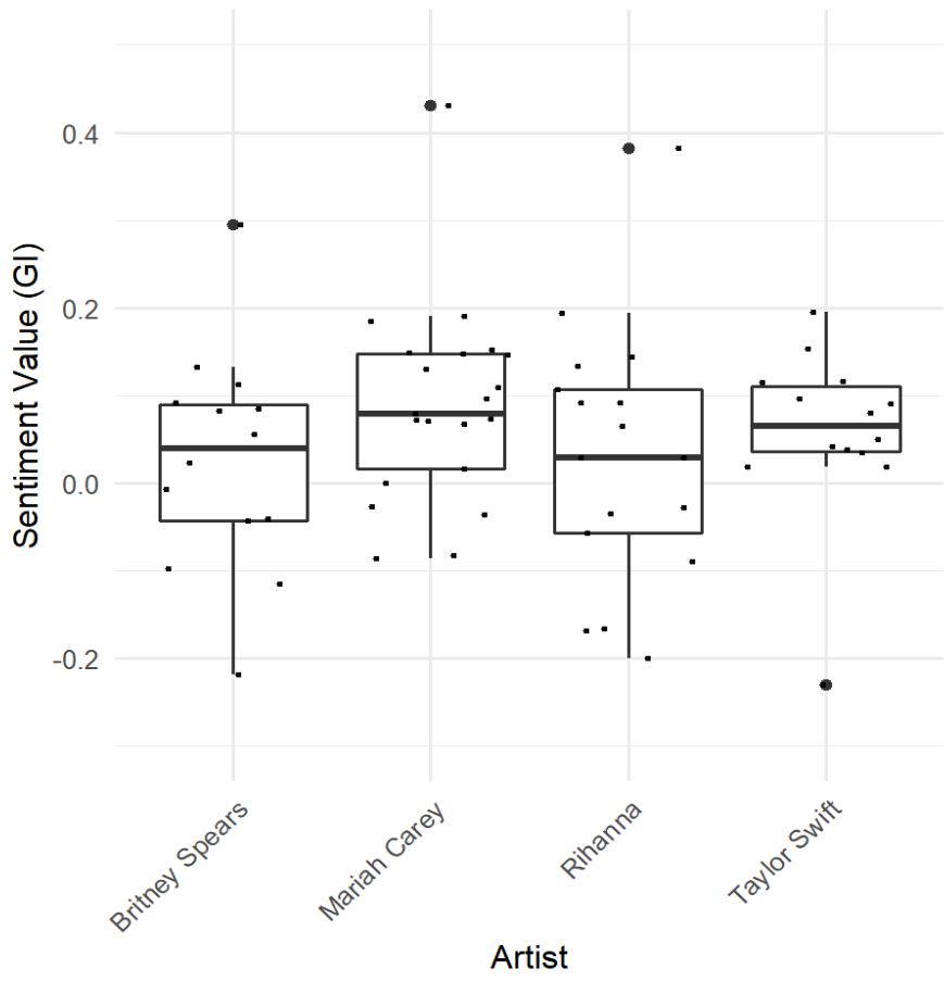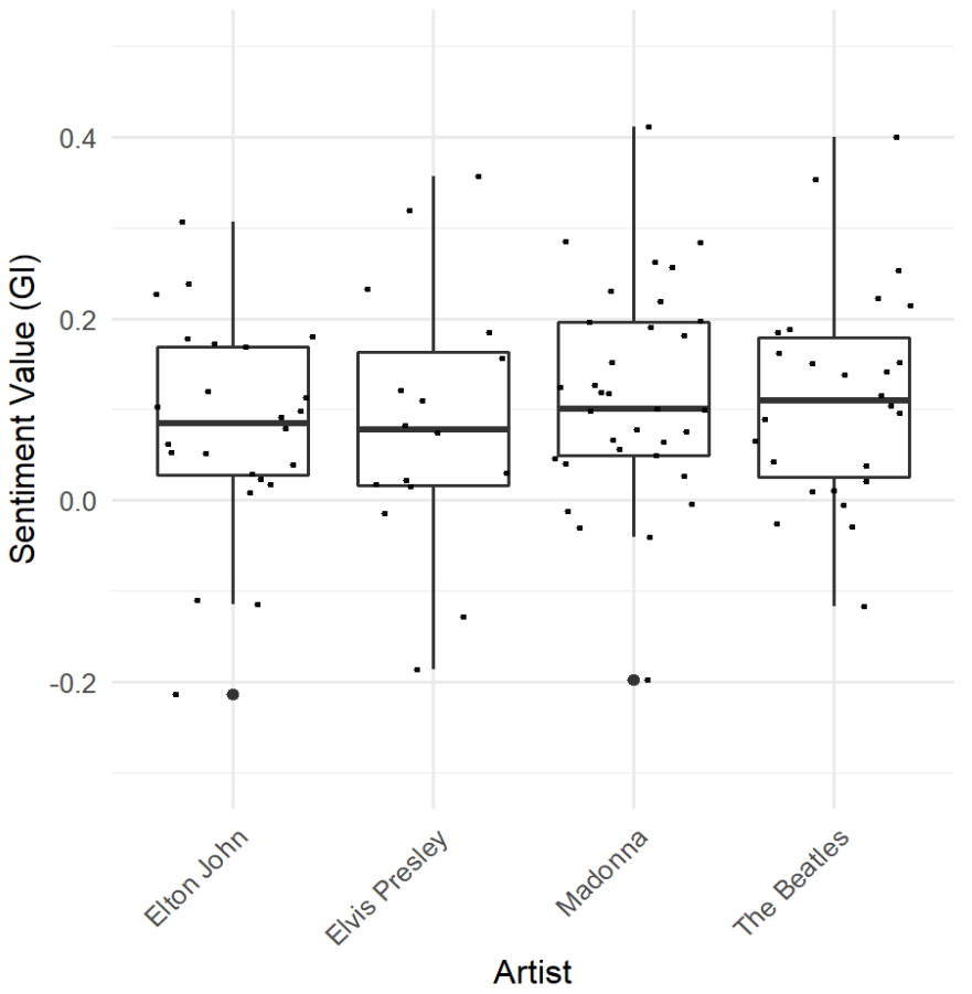 My partner and I created a function that conducts a sentiment analysis on lyrics for songs in the top 100. The required input is an artist name (e.g. Madonna), and the output is a data frame which contains a column for that artists’ Top 100 song titles and a column for the sentiment values for those songs. Sentiment values range from -1 (negative sentiment) to 1 (positive sentiment).